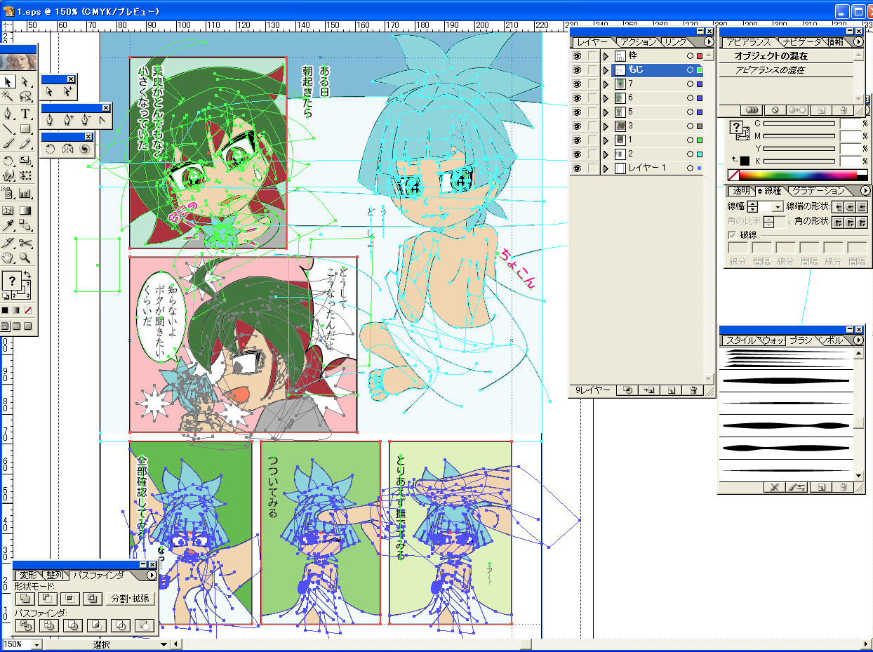 遊戯王用 2016/06/18 千バトで出す本~♪ 何とか間に合いそうです…めちゃめちゃ久々に書きに来ましたよ あああ、アニメは素良くん出なくなっちゃうし、超しょんぼりです 原作は次回出るかな…気失ってる素良くん激カワッ 超負けず嫌いな男の子、良いね そして、多分何とかなりそうな本のことです。 ココに見にくる人いるか解りませんが、一応どんなものか描いておきます。 まず総ページ数は16ページ。またカバーつきにしました。それでもペラッペラw とりあえず描きたい事は全部描ききりました。 全ページフルカラーです。 漫画部分は単調カラー、表紙のみ影付けてます タイトルは「小っちゃくなっちゃったんだけど」です。 キャラクターは素良と遊矢が主です。その他、赤馬社長さんなど出てます。 ギャグ漫画本です。 値段は100円です。 小さくなるって部分はある有名ドラマを元ネタにしました。(私は高橋由美子ちゃん派~) 初めは「~の恋人」な感じにしようかと思ったのですが、バッサリとそのネタ省きました。 ラブはダメだ…私は そして表紙はこれ。 そして見本で漫画の1ページ目だけ、少し下のほうにアップしておきます。 というのも素良くんは今回殆ど服着てません。 でも全然エロくはありません。 きっと私が描くからでしょう でも服着てない素良くんは嫌だという人は見るのを控えた方が良いかもしれません。 下に見本画像ありますので、見たく無い方はこのままバックしてください。 こんな感じです。 自分なりには楽しく描いたので、思い残す事ありません。 普段は漫画描きでは無いので、全体的に歪さはあるかも知れませんが… そういえば福岡の千バト、今年は数回行われるみたいですね。 年に何回も出られませんが、もし次にネタが思いついて何か新しい本を出せそうだったら出ようと思います。 ただ……ちょっと日常的にちょっとぎりぎりになってきているので控えるかもしれませんが ま、どっちでもいいかw その時はHP中心になると思います、今どき少ないですけどね。 夢方面で書きたいこともあるので、そっちもやりたいかなぁと。 あとHPのトップの天使獏良くんを天使素良くんに変えたいかなと おまけですが、こんな感じで書いてます的なことをココにまた書きます。 以前もブログに書いてますがイラストは、Adobe Illustratorでマウス書きしてます。 ペン書きが極端に面倒くさくなってしまって、ここに行き着きました。 作業画面はこんな感じ。 そしてラフ&下書きはこれ。 やる気の無い鉛筆書きw いつもこんな感じです [0回]