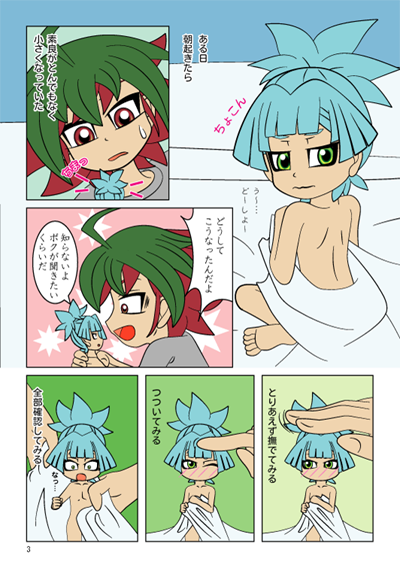 遊戯王用 2016/06/18 千バトで出す本~♪ 何とか間に合いそうです…めちゃめちゃ久々に書きに来ましたよ あああ、アニメは素良くん出なくなっちゃうし、超しょんぼりです 原作は次回出るかな…気失ってる素良くん激カワッ 超負けず嫌いな男の子、良いね そして、多分何とかなりそうな本のことです。 ココに見にくる人いるか解りませんが、一応どんなものか描いておきます。 まず総ページ数は16ページ。またカバーつきにしました。それでもペラッペラw とりあえず描きたい事は全部描ききりました。 全ページフルカラーです。 漫画部分は単調カラー、表紙のみ影付けてます タイトルは「小っちゃくなっちゃったんだけど」です。 キャラクターは素良と遊矢が主です。その他、赤馬社長さんなど出てます。 ギャグ漫画本です。 値段は100円です。 小さくなるって部分はある有名ドラマを元ネタにしました。(私は高橋由美子ちゃん派~) 初めは「~の恋人」な感じにしようかと思ったのですが、バッサリとそのネタ省きました。 ラブはダメだ…私は そして表紙はこれ。 そして見本で漫画の1ページ目だけ、少し下のほうにアップしておきます。 というのも素良くんは今回殆ど服着てません。 でも全然エロくはありません。 きっと私が描くからでしょう でも服着てない素良くんは嫌だという人は見るのを控えた方が良いかもしれません。 下に見本画像ありますので、見たく無い方はこのままバックしてください。 こんな感じです。 自分なりには楽しく描いたので、思い残す事ありません。 普段は漫画描きでは無いので、全体的に歪さはあるかも知れませんが… そういえば福岡の千バト、今年は数回行われるみたいですね。 年に何回も出られませんが、もし次にネタが思いついて何か新しい本を出せそうだったら出ようと思います。 ただ……ちょっと日常的にちょっとぎりぎりになってきているので控えるかもしれませんが ま、どっちでもいいかw その時はHP中心になると思います、今どき少ないですけどね。 夢方面で書きたいこともあるので、そっちもやりたいかなぁと。 あとHPのトップの天使獏良くんを天使素良くんに変えたいかなと おまけですが、こんな感じで書いてます的なことをココにまた書きます。 以前もブログに書いてますがイラストは、Adobe Illustratorでマウス書きしてます。 ペン書きが極端に面倒くさくなってしまって、ここに行き着きました。 作業画面はこんな感じ。 そしてラフ&下書きはこれ。 やる気の無い鉛筆書きw いつもこんな感じです [0回]